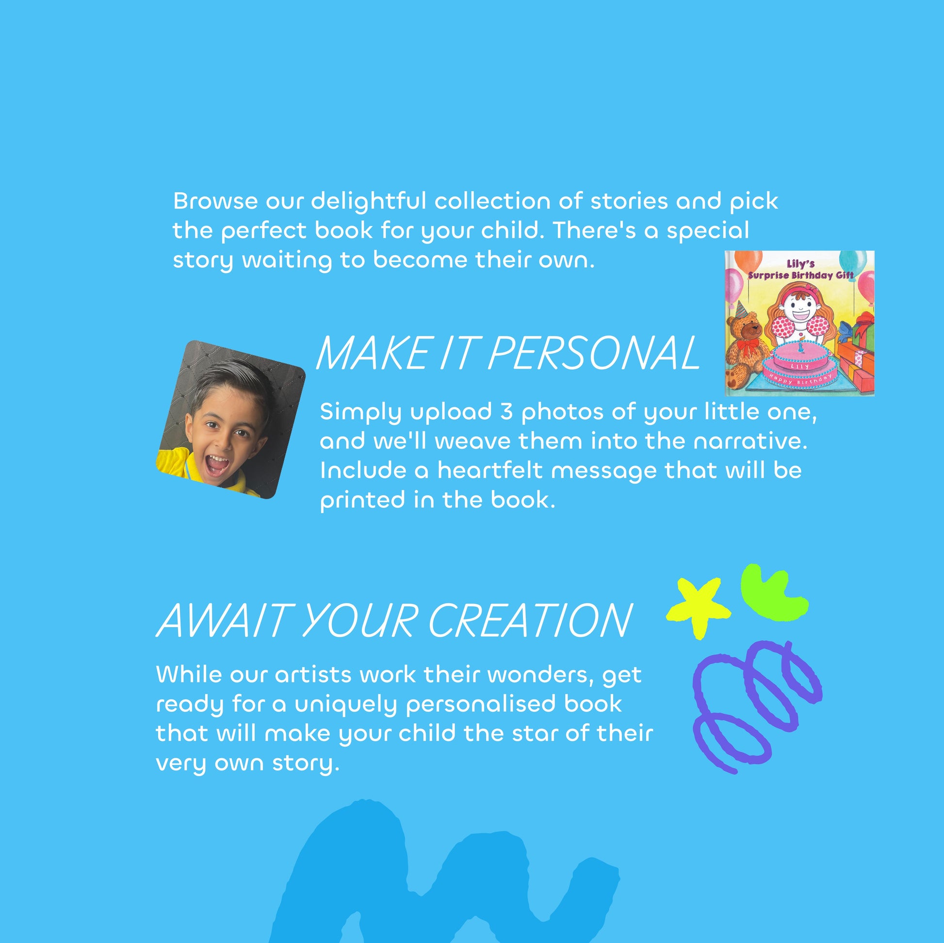A beautifully crafted hardcover book, featuring stunning illustrations by award-winning illustrator Samidha Gunjal. This personalized book includes special details such as the child's name, birthdate, and age—making it truly unique. Even the birthday cake in the story is customized with their name! Plus, the sender can add a heartfelt birthday wish or message on the first page as a dedication, along with the child's picture. Imagine the joy on their face when they see their own name and image in print!